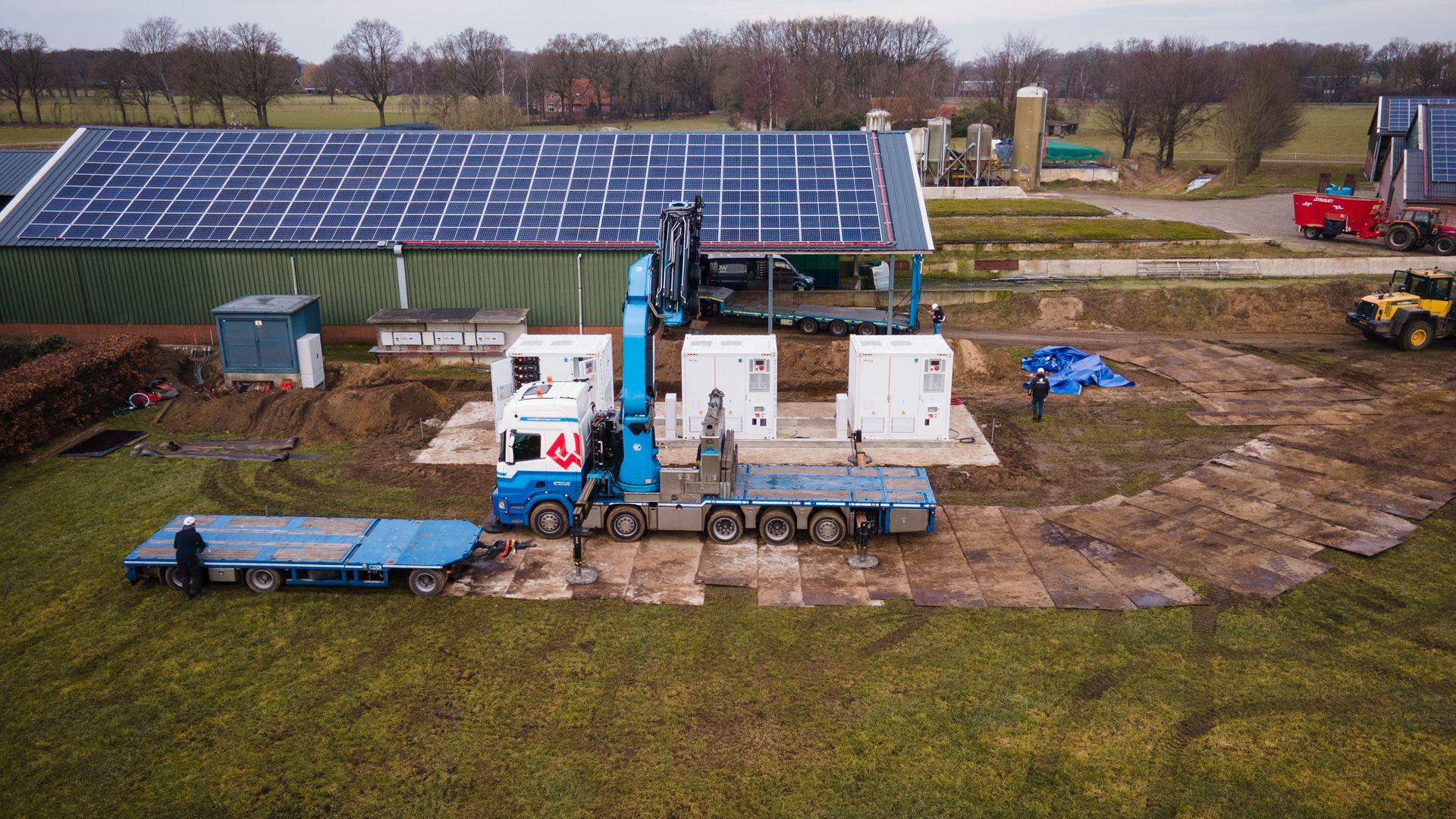 Bij melkveehouder Schilderinck installeerde wij 3 Solax accu containers, waarmee zonne-energie wordt opgeslagen en slim verschoven naar piekmomenten, zodat eigen stroom maximaal wordt benut en netafname wordt beperkt. De containers hebben een opslagcapaciteit van 1044 kWh, wat zorgt voor een totale capaciteit van 3132 kWh.