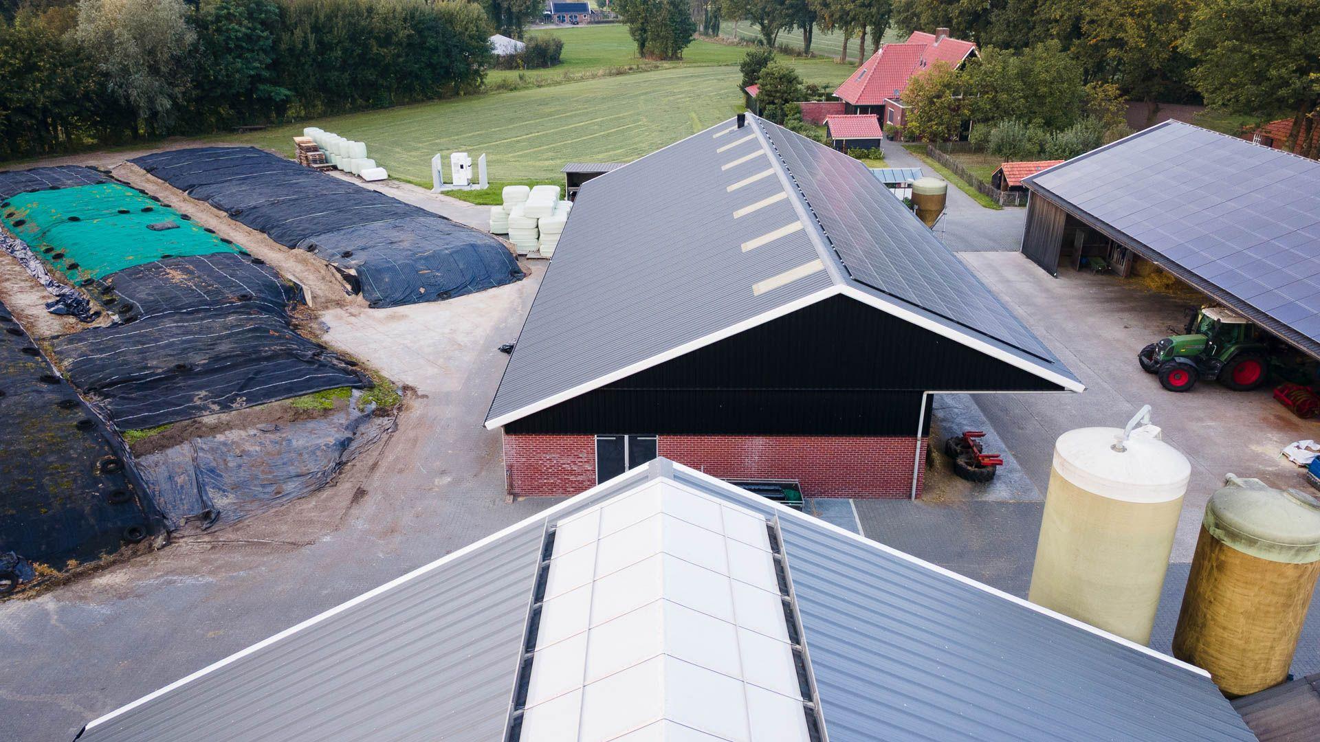 Voor melkveehouder Veelers in Nutter heeft HG Montage een aantal daken gerenoveerd en/of vervangen. HG Energiesystemen heeft twee van de daken voorzien van zonnepanelen en een Solax accu geplaatst voor de opslag van deze energie.